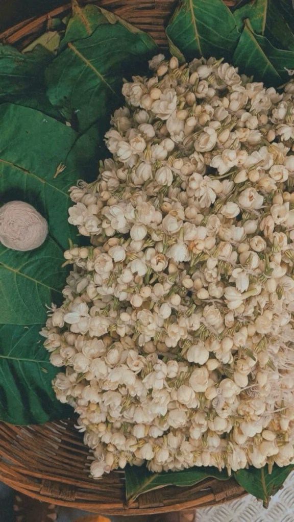 I close my eyes and see two beautiful white gajras, almost pearl-like jasmine flowers strung together in what is called a gajra, nestling within a big green leaf. The gajras have been sprinkled with water to protect them from Bombay’s often harsh humid heat.
