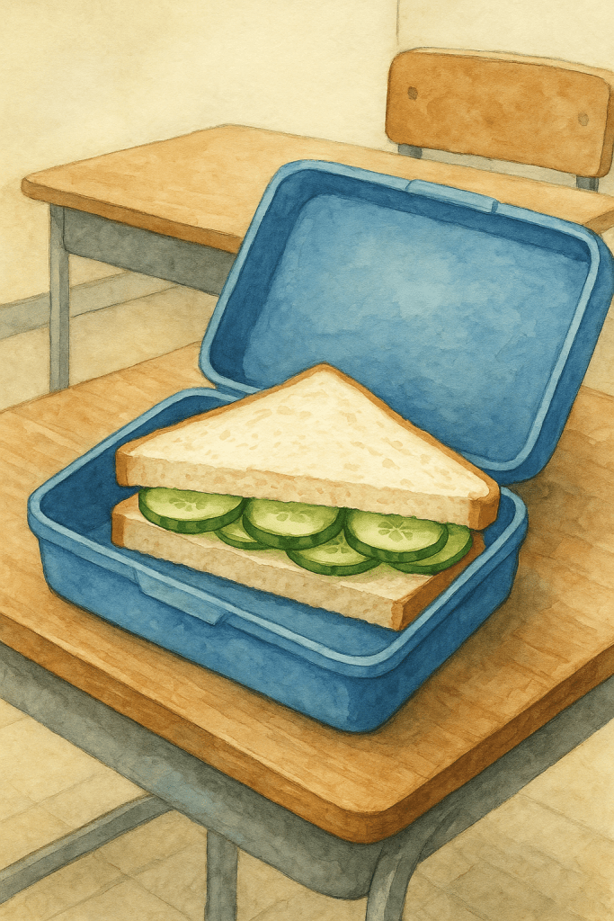 This morning I had neatly packed our memories into your snack box in the form of a cucumber sandwich with chaat masala. I hope you smile when you eat it. I hope it reminds you of Home.
